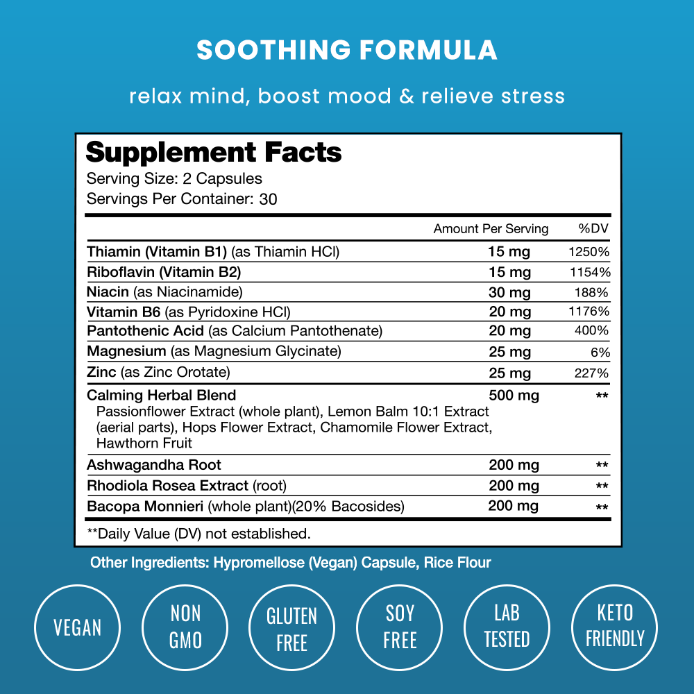 Per Serving: 500mg Calming Herbal Blend - Passionflower Extract (whole plant), Lemon Balm 10:1 Extract (aerial parts), Hops Flower Extract, Chamomile Flower Extract, Hawthorn Fruit