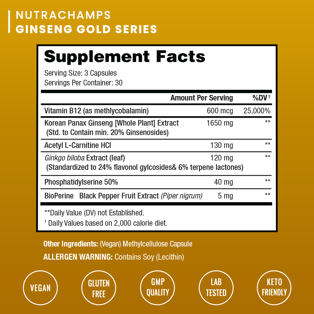 I am very impressed with this NutraChamps formula because it contains a combination of extra ingredients that I haven't seen in other brands of Panax Ginseng. Not only does it contain Ginko Biloba Leaf Extract and Bioperine Black Pepper Extract it also contains Vitamin B12 (methylcobalamin) Acetyl L-Carnitine HCl and Phosphatidylserine. Along with the Korean Red Panax Ginseng Root Extract (with a minimum of 10% Ginsenosides). These are key nutrients to synergistically enhance its energizing physical and cognitive benefits. I have definitely noticed a difference since taking this premium blend. It truly is the Gold Standard in Ginseng Supplements!