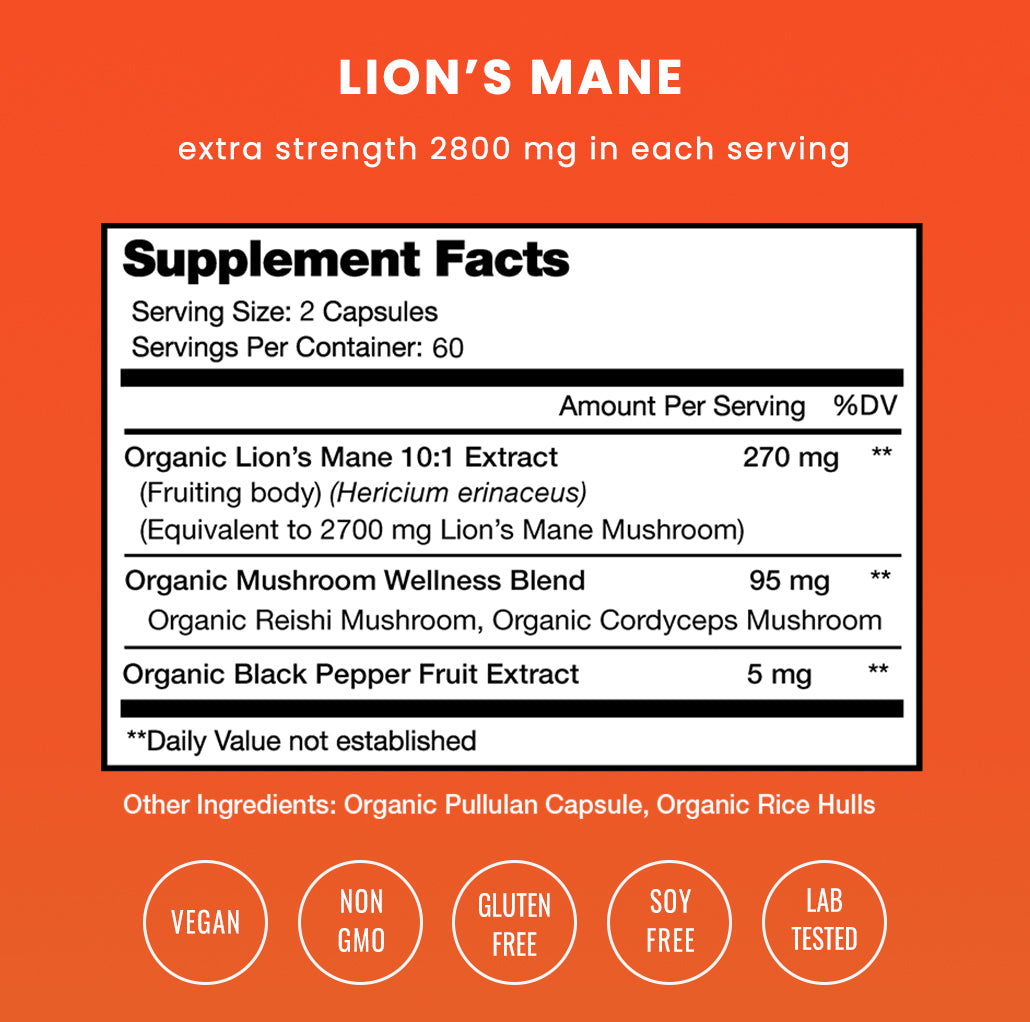Per Serving: 270mg 10:1 Lion’s Mane Mushroom Extract (Equivalent to 2700mg Lion's Mane Mushroom)