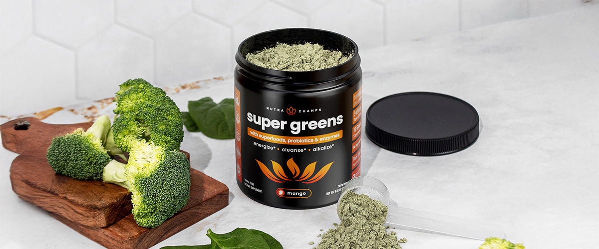 After one meticulous year in the making, we’re proud to finally bring you a premium greens powder that is both delicious AND nutritious. Loaded with organic ingredients, Super Greens is truly so much more than a basic “greens powder”. As if it's Organic Greens Blend wasn’t enough, you get a huge antioxidant blend of fruits & veggies to top it off. Our greens also contains an enzyme & probiotic blend to deliver digestive support to ensure you’re giving your gut what it needs to absorb all of this goodness & keep you feeling amazing. Did we also mention this version of our Super Greens is Mango flavored?