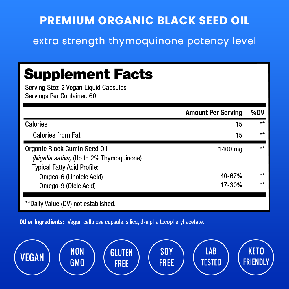 Per Serving: Per Serving: 1400mg Organic Black Cumin Seed Oil (Nigella Sativa) (Up to 2% Thymoquinone)