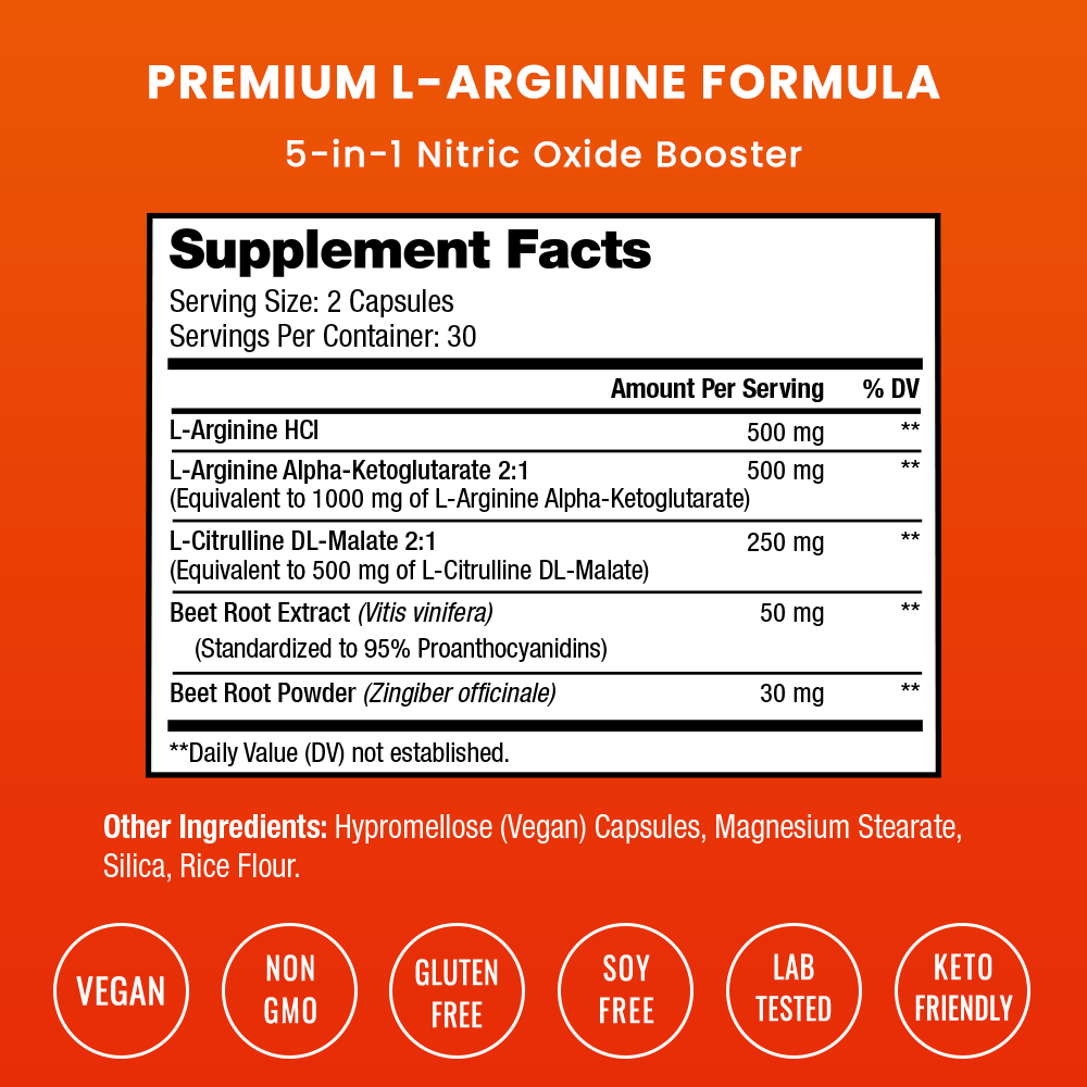 Per Serving: 500mg L-Arginine Alphaketoglutarate 2:1 (Equivalent to 1000 mg of L-Arginine Alpha-Ketoglutarate)