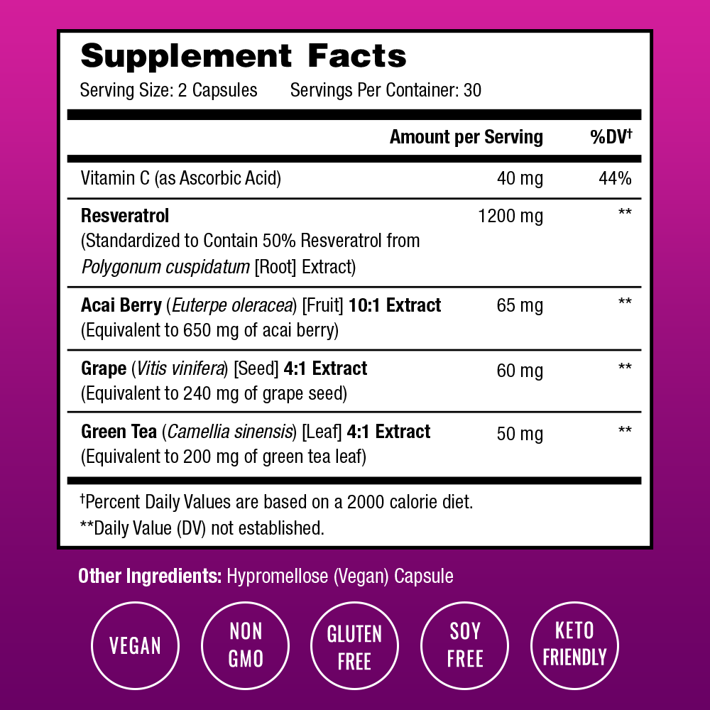 Per Serving: 1200mg Resveratrol (Standardized to 50% Pure Trans-Resveratrol; from Polygonum cuspidatum Root Extract)
