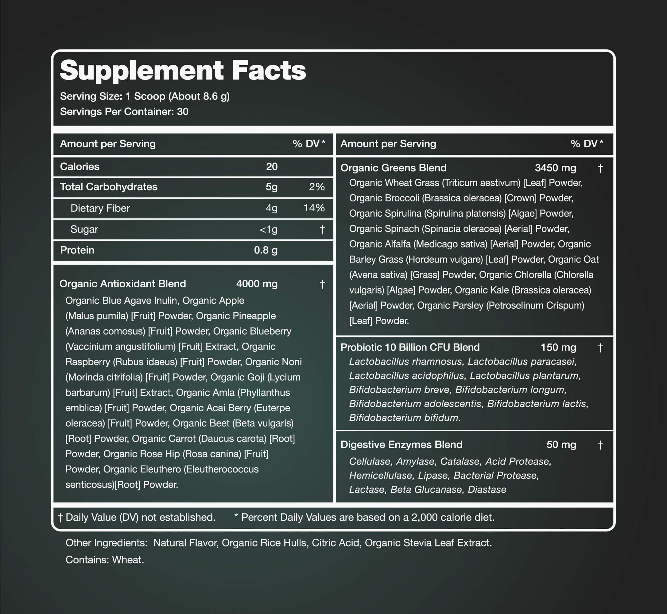 Super Greens was designed to offer support for five major areas of health, including energy, immunity, gut health, brain health & focus, and healthy aging.