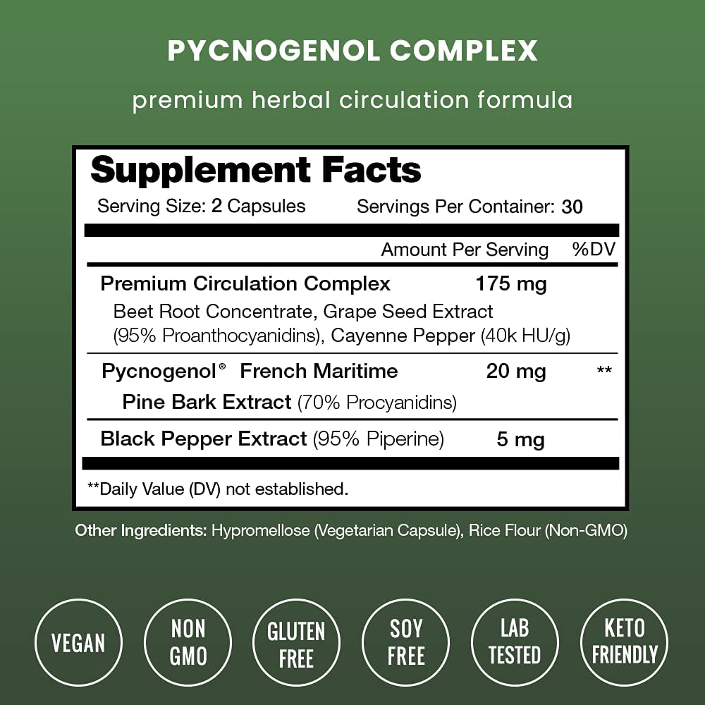 Per Serving: 175mg Premium Circulation Complex (Beet Root Concentrate, Grape Seed Extract (95% Proanthocyanidins), Cayenne Pepper (40k HU/g))