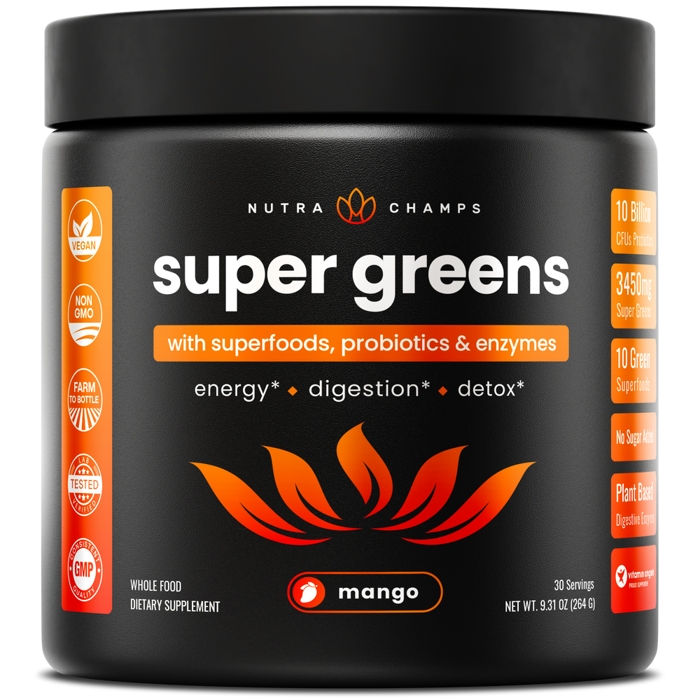 After one meticulous year in the making, we’re proud to finally bring you a premium greens powder that is both delicious AND nutritious. Loaded with organic ingredients, Super Greens is truly so much more than a basic “greens powder”. As if it's Organic Greens Blend wasn’t enough, you get a huge antioxidant blend of fruits & veggies to top it off. Our greens also contains an enzyme & probiotic blend to deliver digestive support to ensure you’re giving your gut what it needs to absorb all of this goodness & keep you feeling amazing. Did we also mention this version of our Super Greens is Mango flavored?