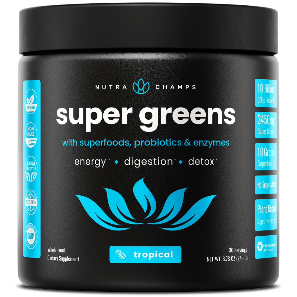 After one meticulous year in the making, we’re proud to finally bring you a premium greens powder that is both delicious AND nutritious. Loaded with organic ingredients, Super Greens is truly so much more than a basic “greens powder”. As if it's Organic Greens Blend wasn’t enough, you get a huge antioxidant blend of fruits & veggies to top it off. Our greens also contains an enzyme & probiotic blend to deliver digestive support to ensure you’re giving your gut what it needs to absorb all of this goodness & keep you feeling amazing. Did we also mention this version of our Super Greens is wonderfully tropical flavored?